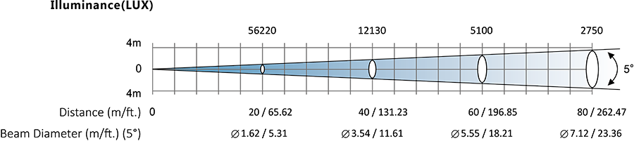 Beam angle: 5° (zoom range 10° - 25° with frost)