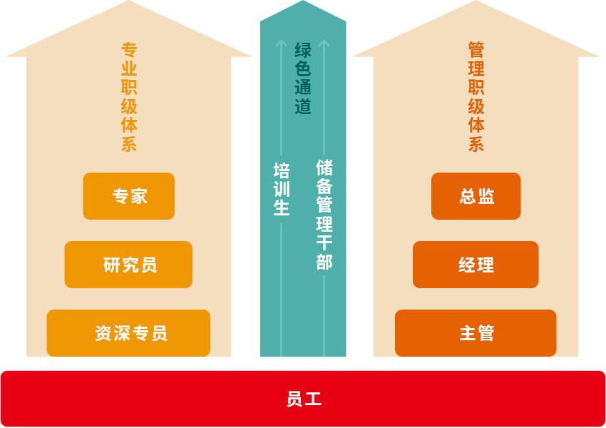 公司致力于建设职业发展“2+1”通道,引导员工规划职业生涯,通过阶梯培训和工作实践推动员工持续提升自身的责任意识、服务意识、知识水平、技能水平、沟通能力、管理能力等职业素养,实现人才发展的多元化、专业化。职业发展“2+1”通道:2个主通道(管理通道、技术通道),1个绿色通道(储干通道)。