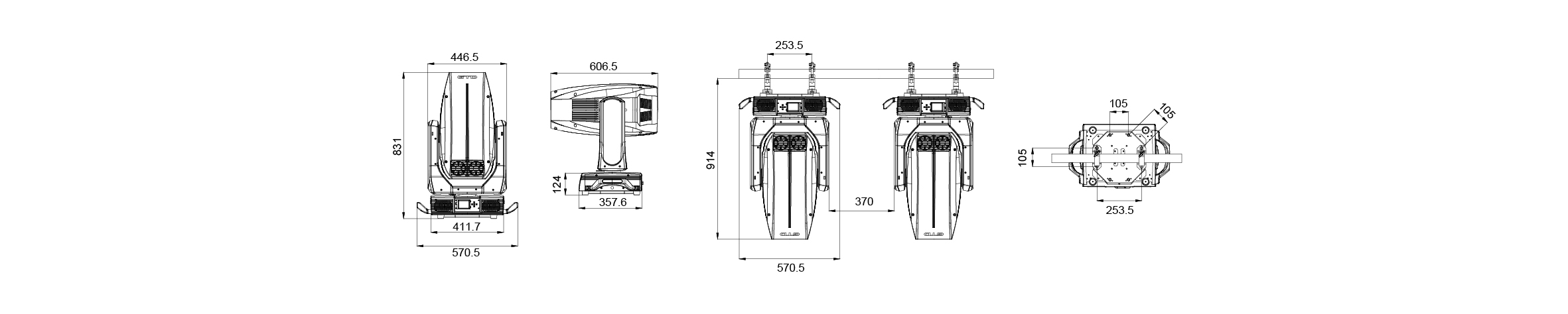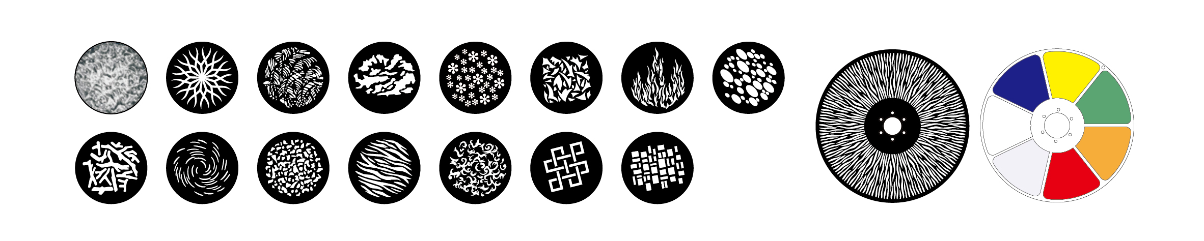 Color wheel: 6 colors + open, split color, CW/CCW rotation, variable speed, "Rainbow effect” in both directions