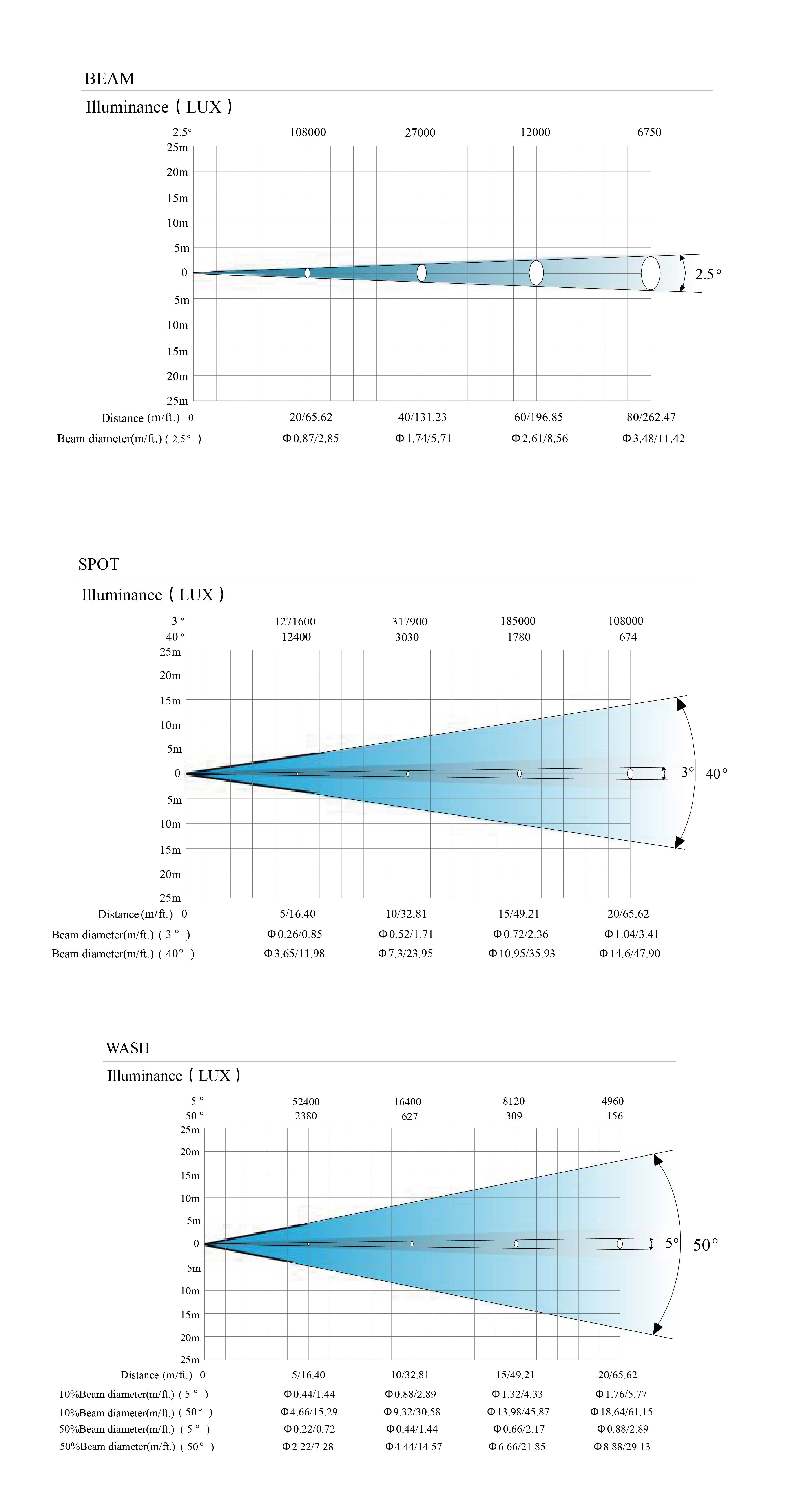 · Zoom range: BEAM 0°~2.5°/ SPOT 3°~ 40°/WASH 5°~ 50°