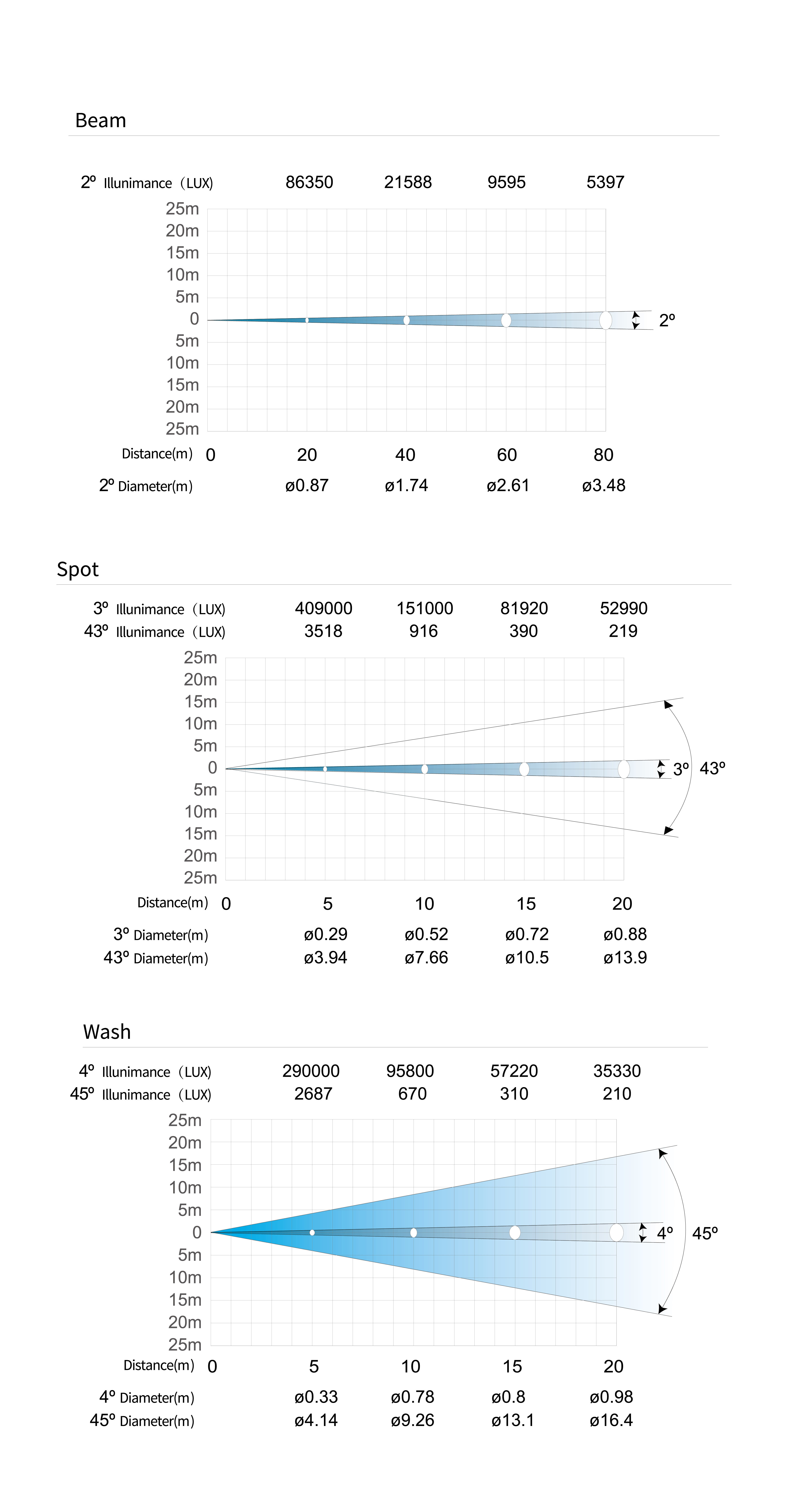 · Zoom range: BEAM 0° - 2° / SPOT 3° - 43° / WASH 4° - 45°