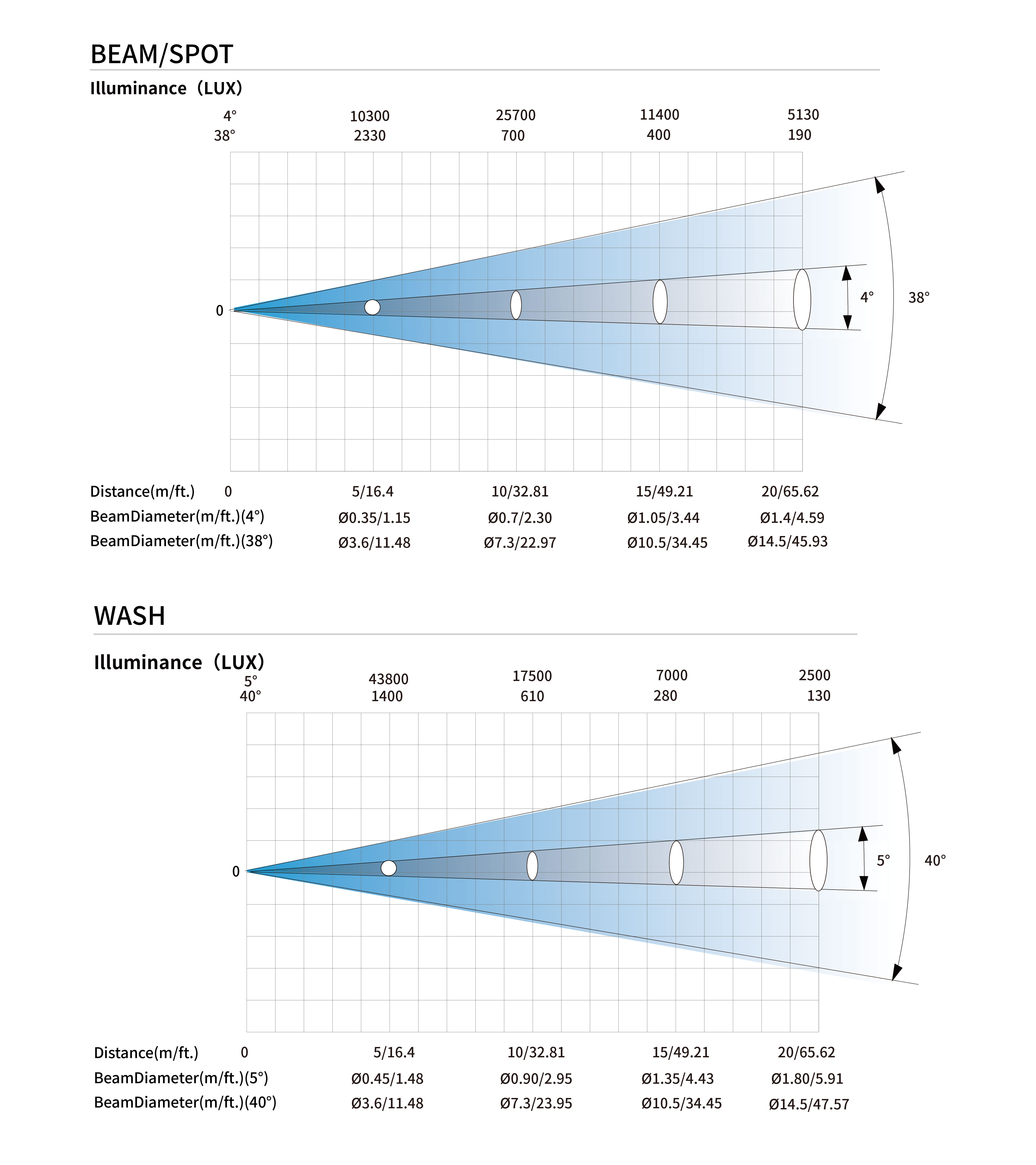 · Zoom: 4°~ 38°@Beam/Spot mode, 5°~ 40°@Wash mode