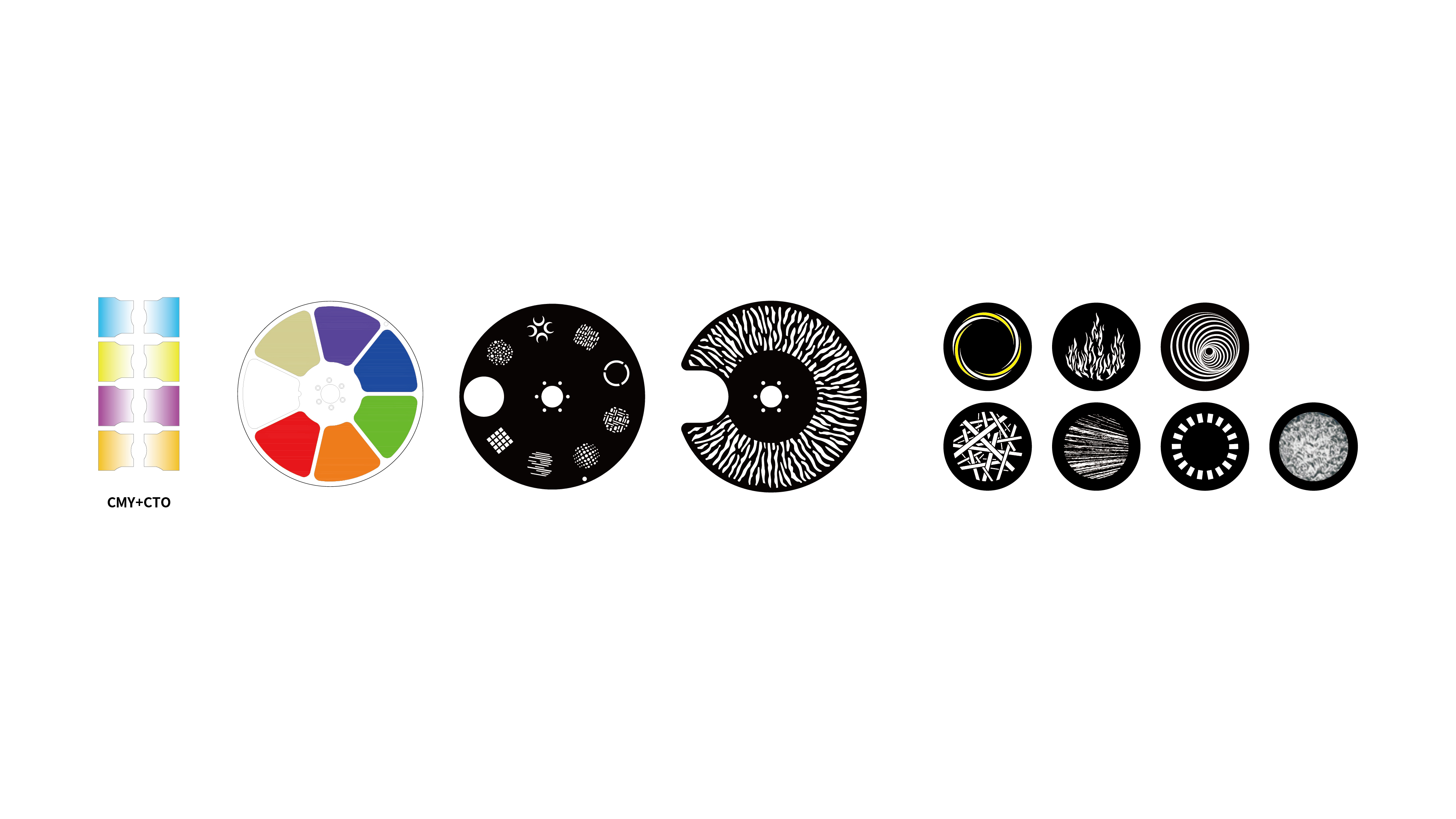 · Static gobo: 1 static gobo wheel with 8 gobos+ white, variable speed shaking and two-way rotating.