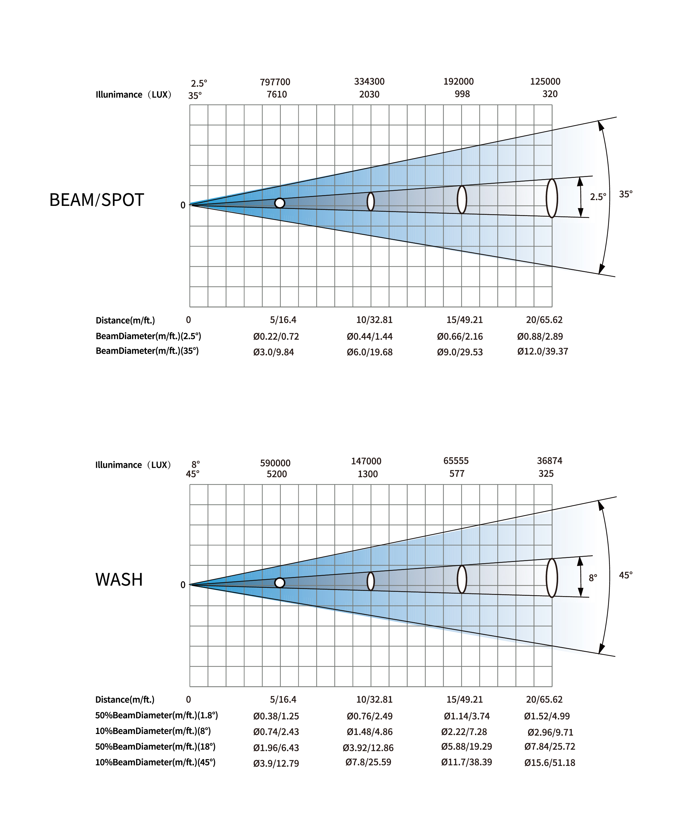 · Zoom: Beam/Spot 2.5°- 35°, Wash 8°- 45°