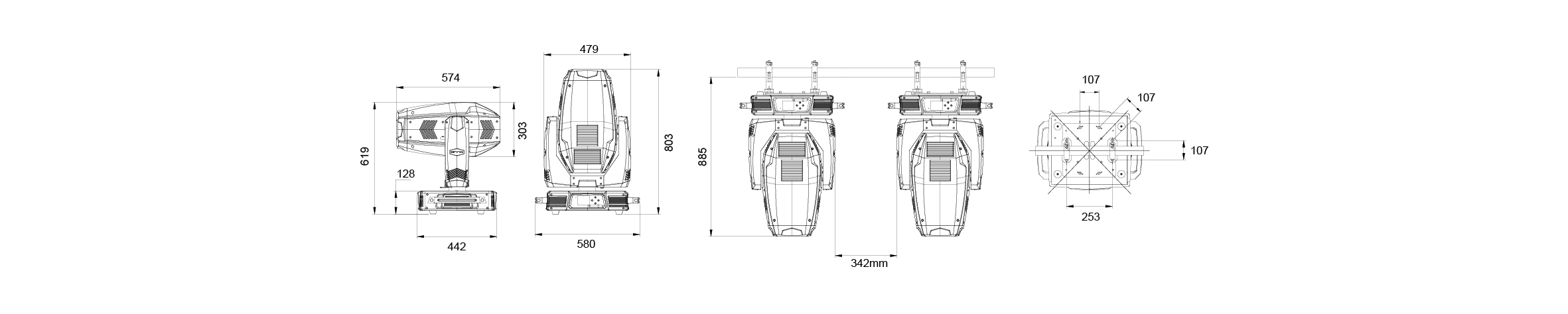 Rotating gobo: 2 rotating gobo wheels, 6 interchangeable gobos + open, 5 interchangeable gobos + open, indexing, CW/CCW rotation, variable speed